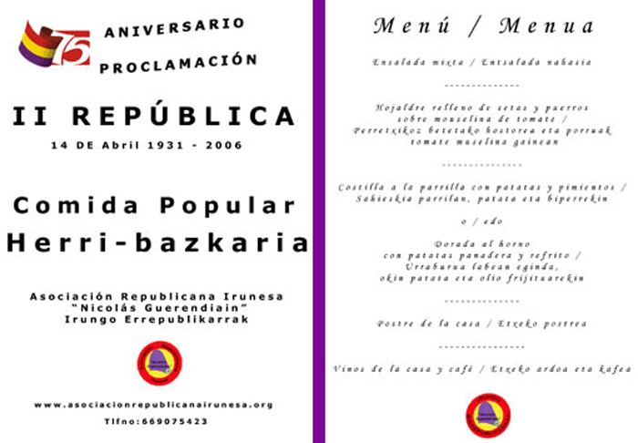 13:00etan San Juan Plazan txalaparta jo zuen eta Irungo Musika banda Riegoren ereserkia jo zuen errepublikaren bandera Marcelo Usabiagak goratzen zuen bitartean. Ondoren, Irungo Atsegina jatetxean herri bazkaria. Menua